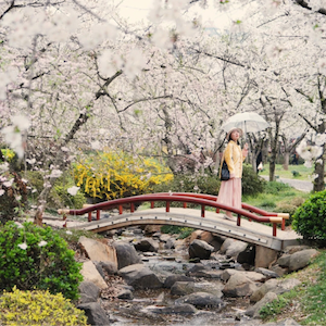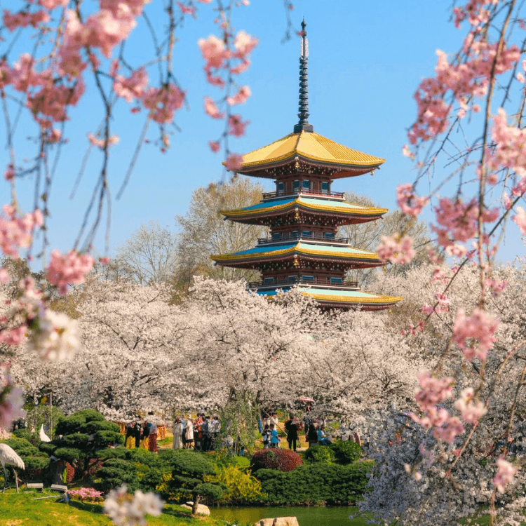 - Chụp ảnh check-in với tháp Ngũ Trọng - biểu tượng của vườn hoa, được bao quanh bởi biển hoa anh đào.